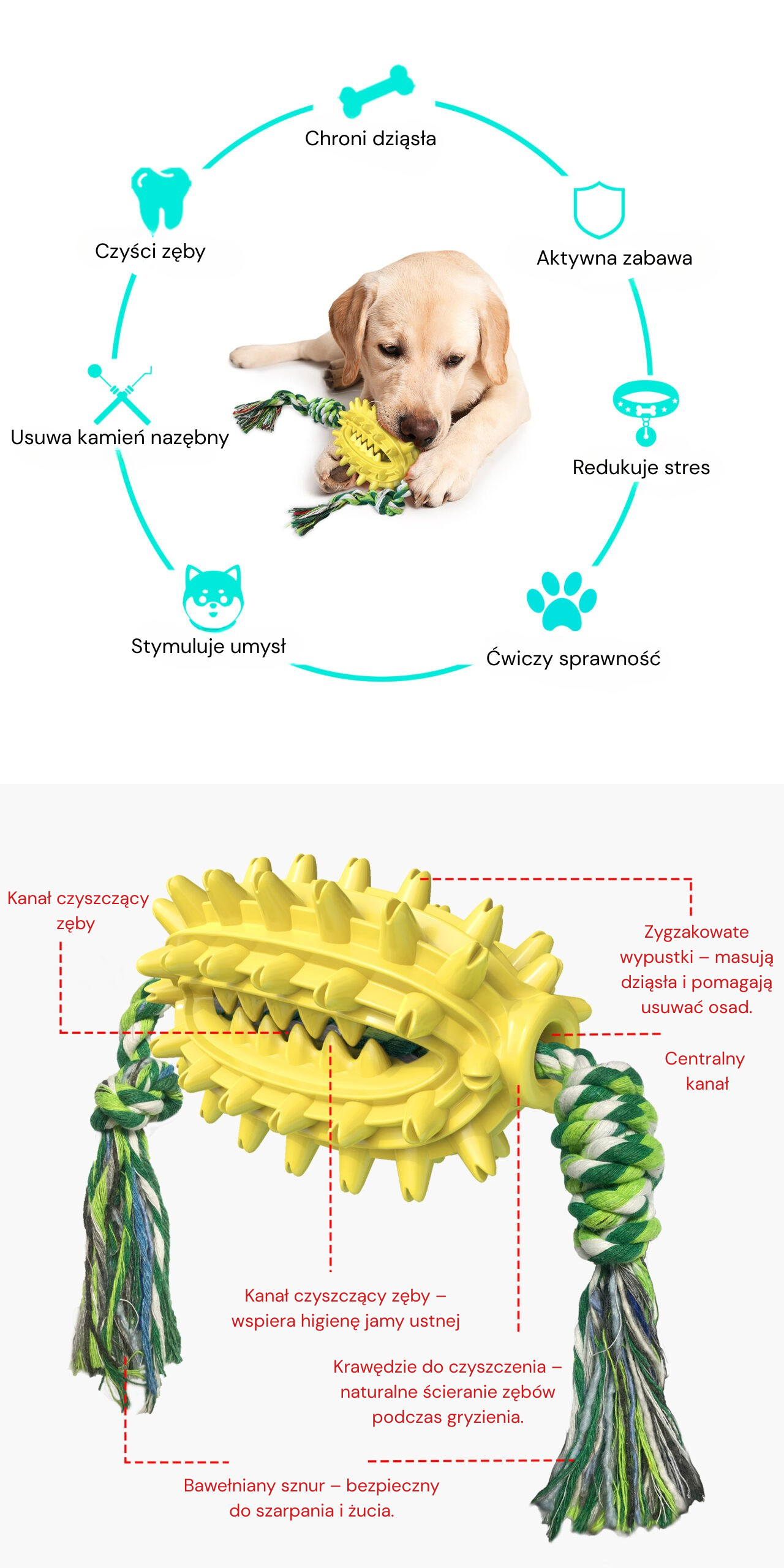 Wybierz tę zabawkę, aby zapewnić swojemu psu zdrowie zębów, aktywność fizyczną oraz równie ważną stymulację umysłową – wszystko w jednej funkcjonalnej i trwałej formie!