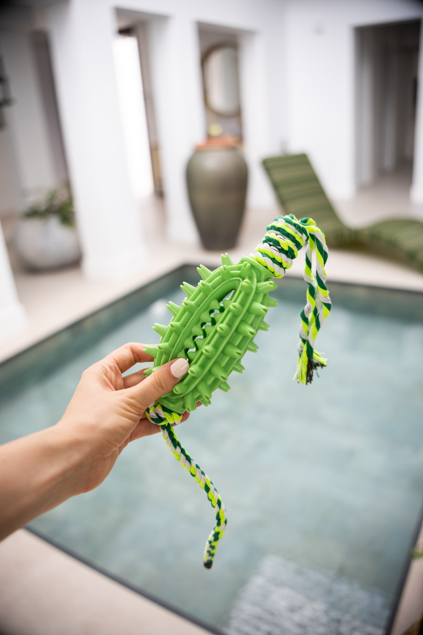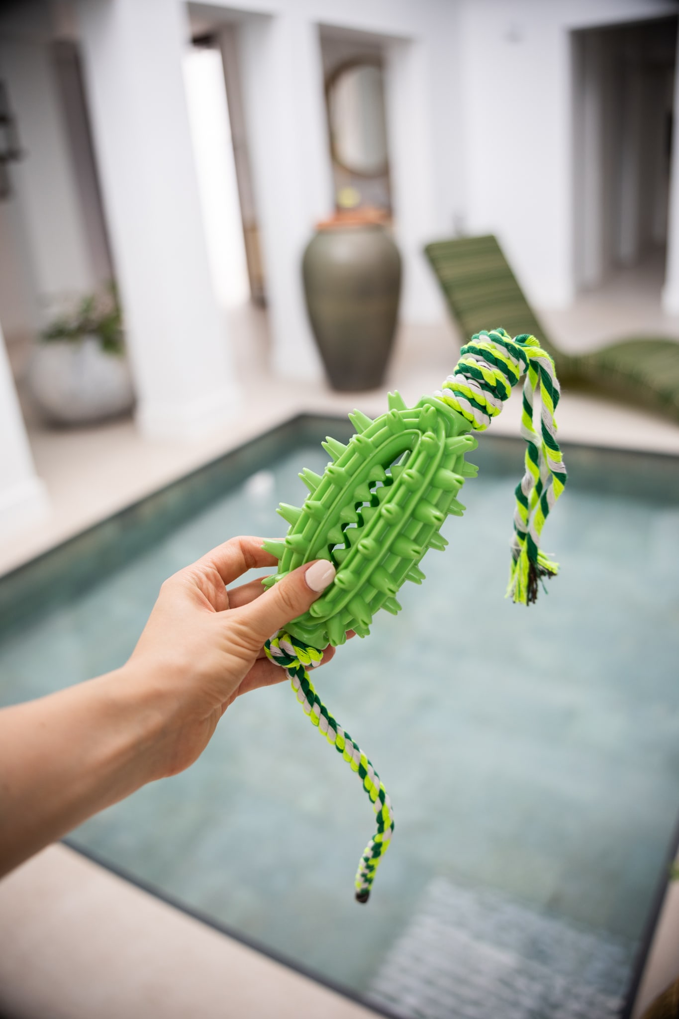 Dodatkowo, zabawkę wyposażono w miękkie bawełniane liny na końcach, które sprzyjają interaktywnej zabawie z psem, a także pomagają w utrzymaniu zdrowych dziąseł poprzez delikatny masaż podczas żucia i przeciągania.