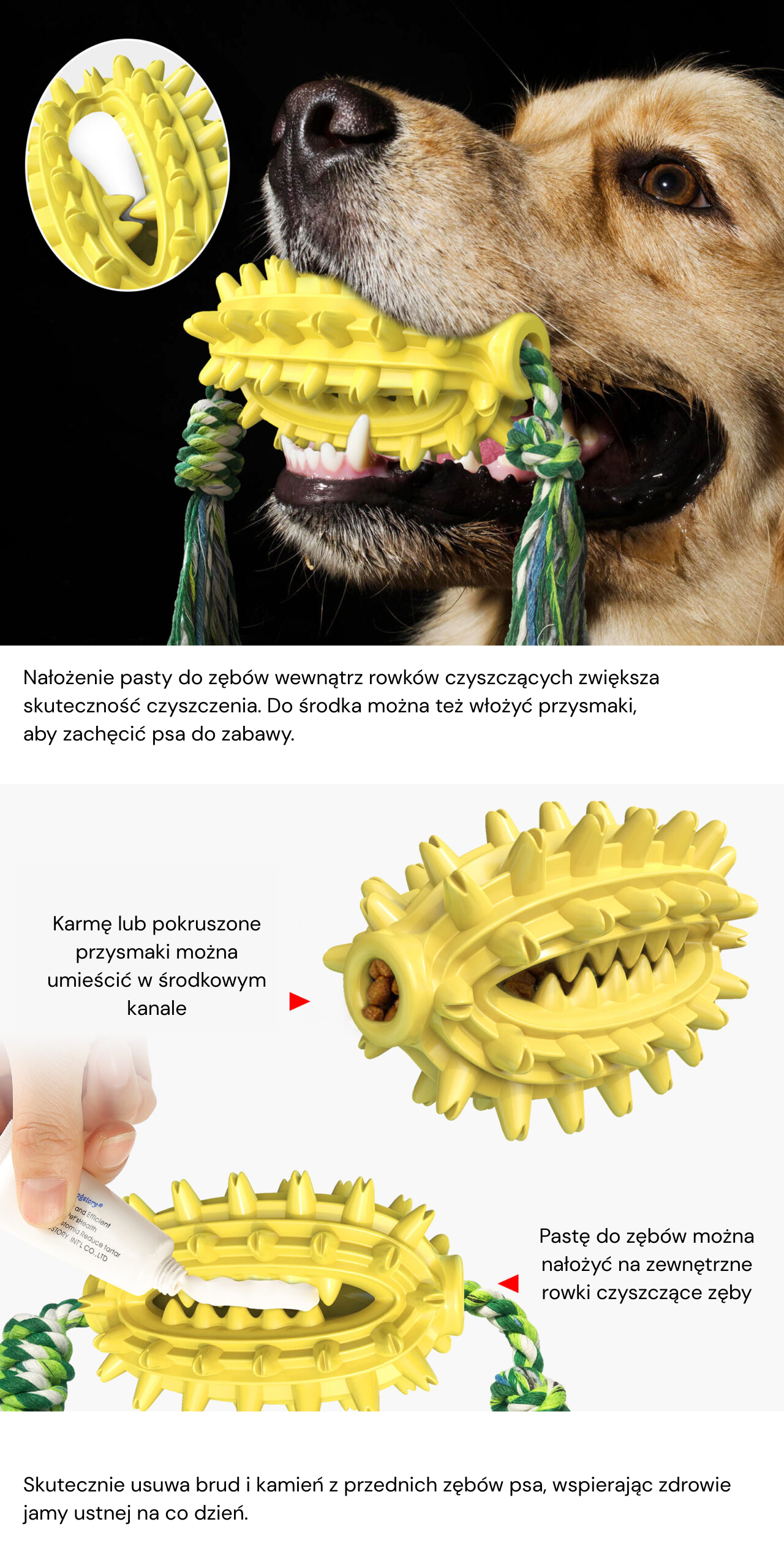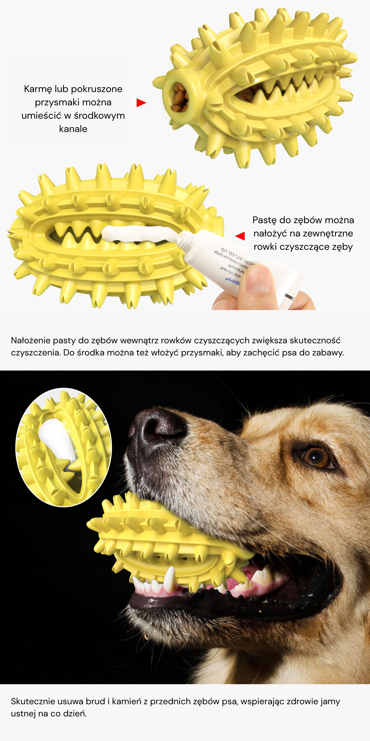 Skuteczne czyszczenie zębów i masaż dziąseł – specjalne, kolczaste wypustki na powierzchni gryzaka pomagają usuwać osad i zapobiegać powstawaniu kamienia nazębnego, a także delikatnie masują dziąsła, wspierając zdrowie jamy ustnej Twojego psa.